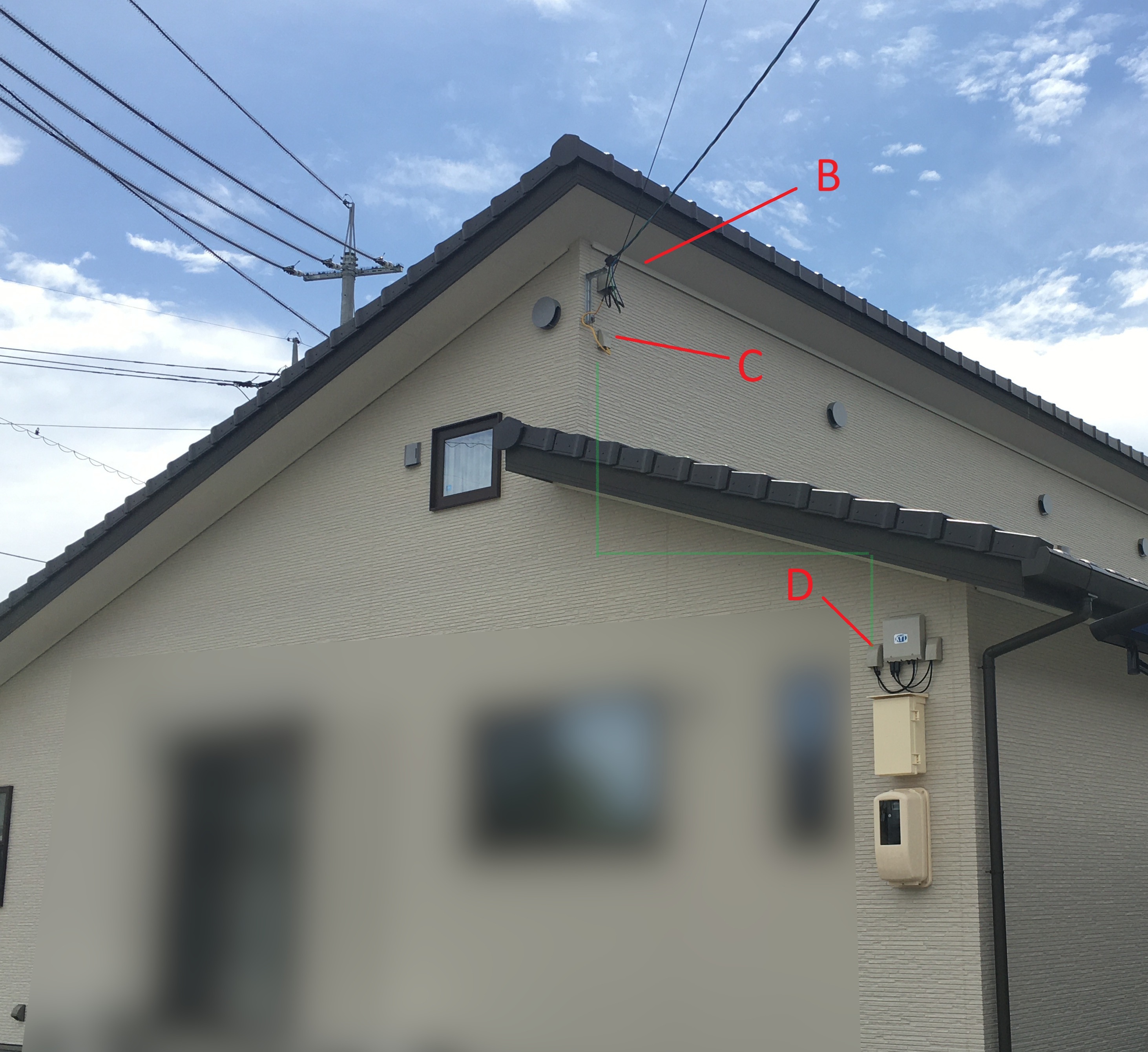 2 . 第一引き留め点(B)、入線カバー1(C)から隠ぺい配管を経由して、入線カバー2(D)まで通線します。(施工:鏡野町指定業者)