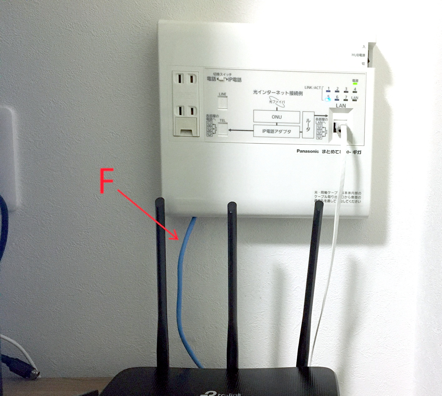成端箱(E)から宅内へ配線したLANケーブル(F)は、ルーターの、インターネット/WANポートに接続します。(作業:契約者様/施主様)