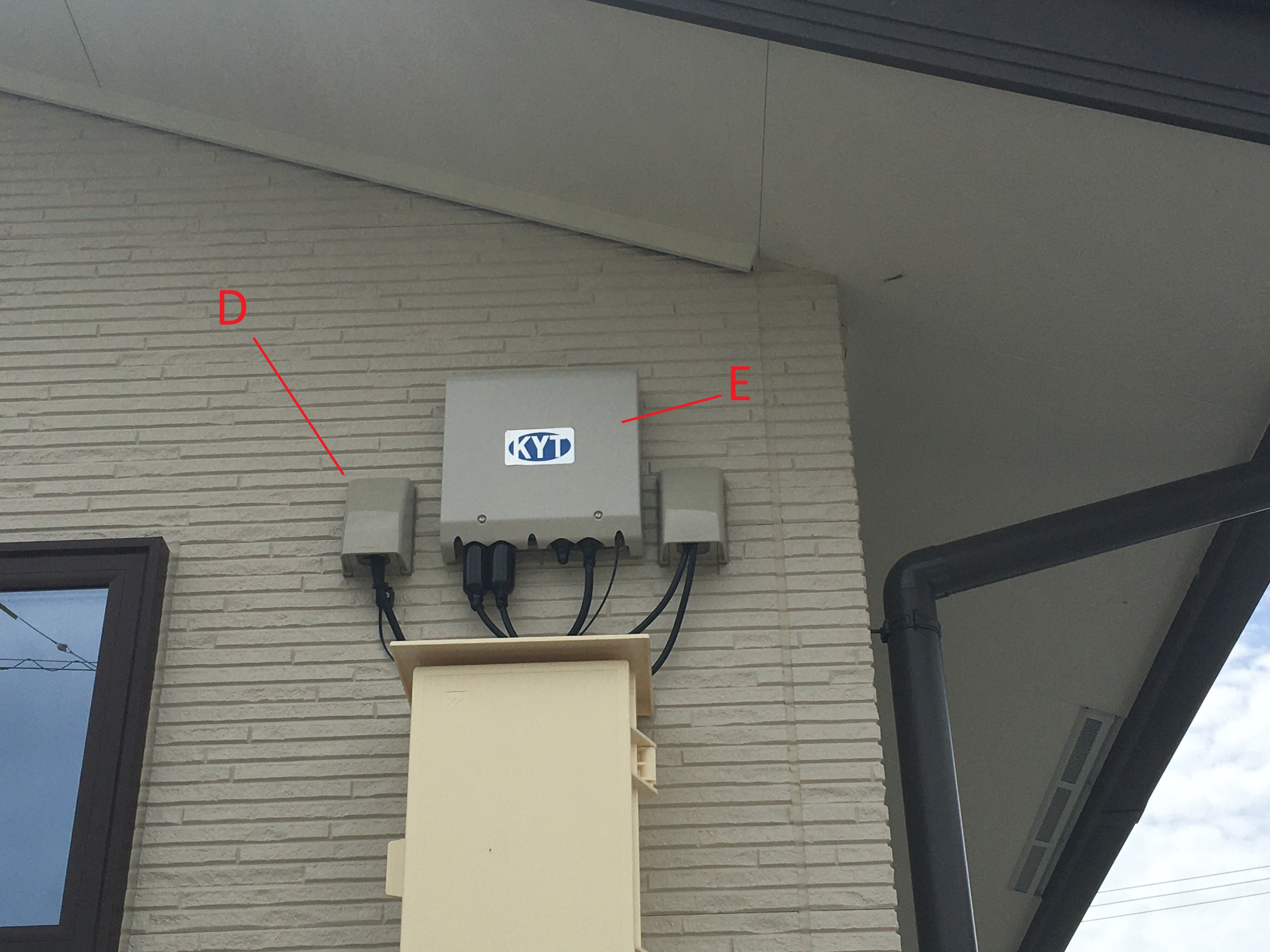 3 . 成端箱(E)を設置し、入線カバー2(D)から、成端箱(E)へ光ファイバー引込線を接続します(施工:鏡野町指定業者)