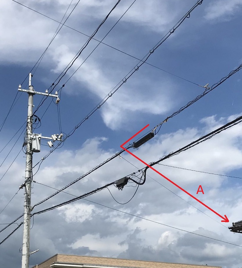 1 . 電柱から光ファイバー引込線(A)を契約者建物へ引き込む(施工:鏡野町指定業者)