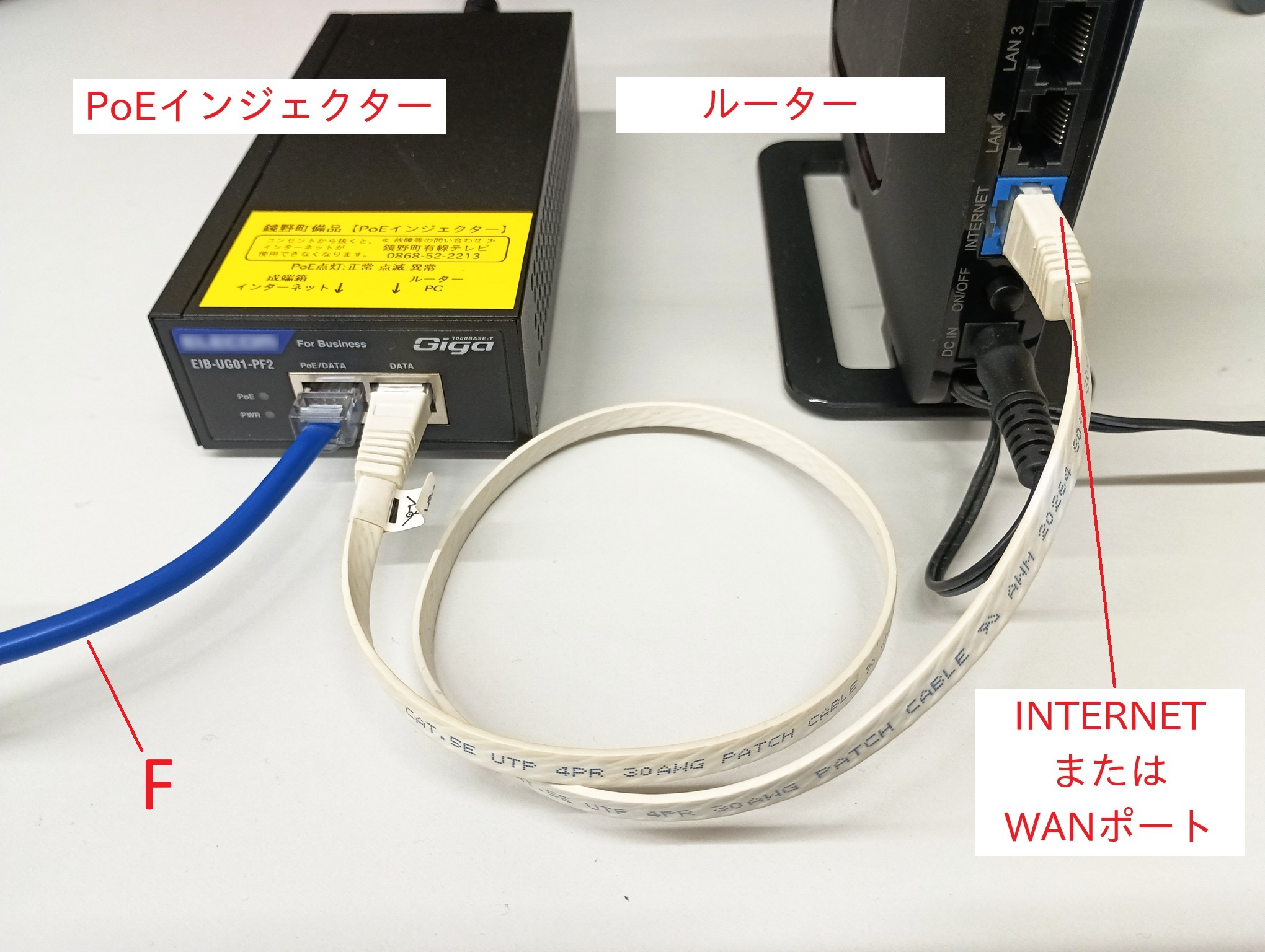 ※ PoEインジェクターが インターネット/WAN側のLANケーブル(F)とルーターの間に入ります。(設置:鏡野町指定業者)